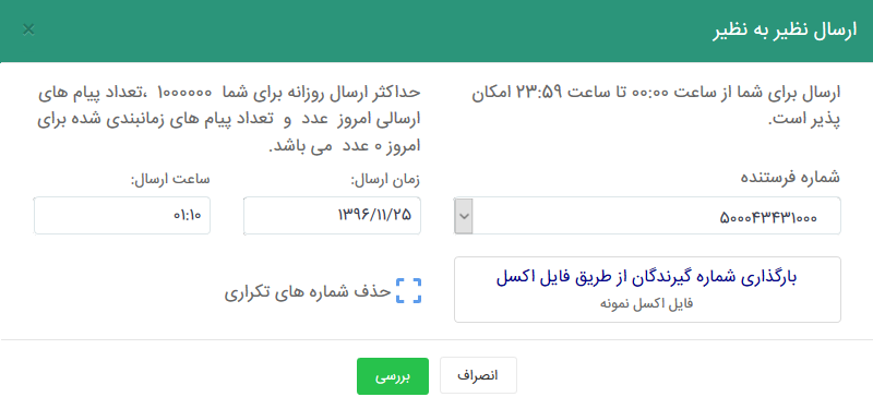 در این قسمت میتوانید اقدام به ارسال پیام به شماره های مورد نظر خود نمایید. در قسمت شماره فرستنده سر شماره خود را برای ارسال انتخاب کنید سپس شماره های مورد نظر خود را در قسمت گیرندگان واردنموده یا از طریق دانلود فایل اکسل نمونه و وارد کردن شماره های مورد نظر و بارگذاری فایل، پیام مورد نظرخود را ارسال نمایید.همچنین با تعیین زمان و ساعت ارسال میتوانید پیام های خودرا در زمان انتخابی ارسال فرمایید.